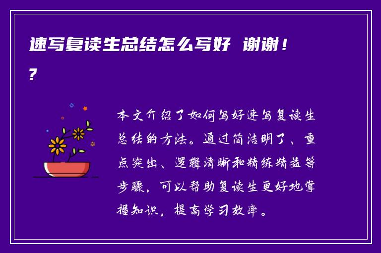 总之,写好速写复读生总结对于复读生来说是非常重要的。只有通过不断地总结,才能更好地掌握知识,提高学习效率。希望以上方法能够帮助复读生们写出更好的总结。