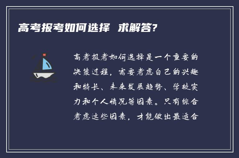 总之,高考报考如何选择是一个综合考量的过程,要根据自己的兴趣和特长、未来发展趋势、学校实力和个人情况等因素进行综合考虑,做出最适合自己的选择。