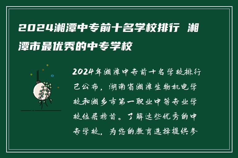 2024湘潭中专前十名学校排行:湖南省湘潭生物机电学校、湘潭市经贸职业中专学校、湖南吉利汽车职业技术学院中专部、湘乡市第一职业中等专业学校、韶山市职业中等专业学校、湘潭县第一职业中等专业学校、湘潭县科旺中等职业技术学校、湘乡市中南计算机职业学校、湘潭烟草中专学校、湘潭市二轻职工中专学校。