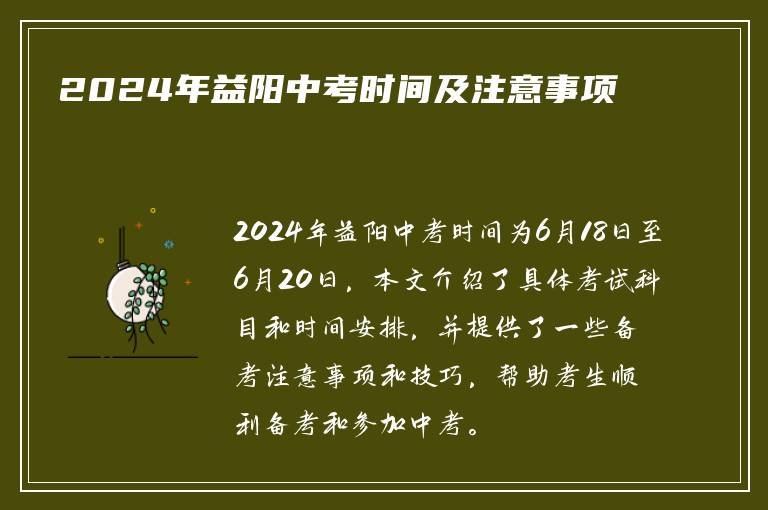 2024年益阳中考时间是几月几号?根据最新消息,2024年益阳中考将于6月18日至6月20日举行。具体考试科目和时间安排如下: