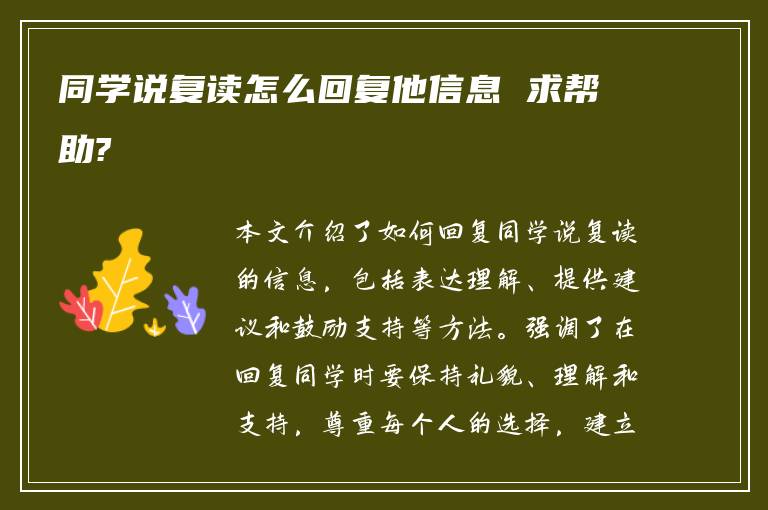 本文介绍了如何回复同学说复读的信息,包括表达理解、提供建议和鼓励支持等方法。强调了在回复同学时要保持礼貌、理解和支持,尊重每个人的选择,建立良好的人际关系。...