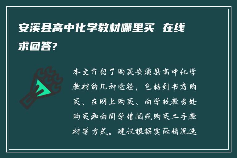 本文介绍了购买安溪县高中化学教材的几种途径,包括到书店购买、在网上购买、向学校教务处购买和向同学借阅或购买二手教材等方式。建议根据实际情况选择最适合自己的购买方式...