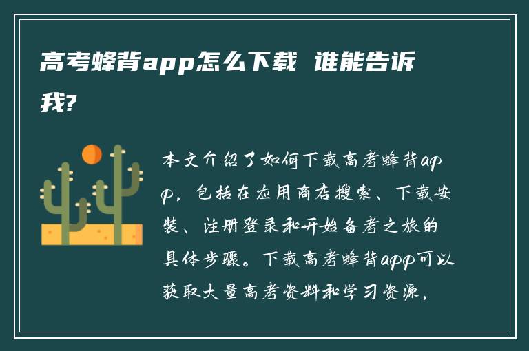 本文介绍了如何下载高考蜂背app,包括在应用商店搜索、下载安装、注册登录和开始备考之旅的具体步骤。下载高考蜂背app可以获取大量高考资料和学习资源,帮助高中生和家长备考高...