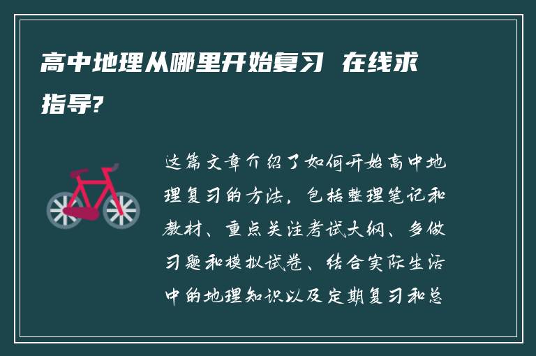 这篇文章介绍了如何开始高中地理复习的方法,包括整理笔记和教材、重点关注考试大纲、多做习题和模拟试卷、结合实际生活中的地理知识以及定期复习和总结。通过这些方法,可以更...