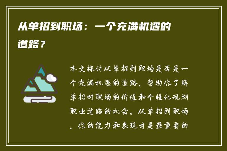 本文探讨从单招到职场是否是一个充满机遇的道路,帮助你了解单招对职场的价值和个性化规划职业道路的机会。从单招到职场,你的能力和表现才是最重要的。...