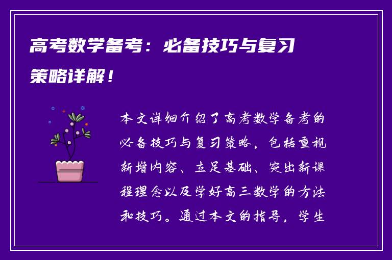 本文详细介绍了高考数学备考的必备技巧与复习策略,包括重视新增内容、立足基础、突出新课程理念以及学好高三数学的方法和技巧。通过本文的指导,学生们可以更好地备考高考数学...